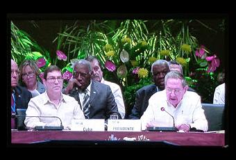 Tampoco olvidaremos el permanente respaldo que todos los gobiernos aquí representados han dado a nuestra justa demanda de que se ponga fin al bloqueo económico, comercial y financiero impuesto por los Estados Unidos contra Cuba, que se mantiene vigente, a pesar de haber sido rechazado en 24 ocasiones en la Asamblea General de las Naciones Unidas y en otros importantes foros, como la Cumbre de las Américas celebrada el pasado año en Panamá, y de las medidas positivas, pero insuficientes, adoptadas por el gobierno norteamericano.