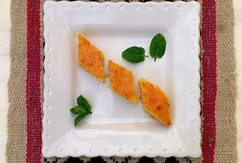 Precalentamos el horno a 200º.Engrasamos con mantequilla un molde rectangular de 30x20 cm.En un bol ponemos la harina con la sémola y la sal. Reservamos.Separamos las yemas de las claras y colocamos en otro bol las yemas y el azúcar y batimos hasta que blanquen.Añadimos la harina con la sémola y la sal incorporando bien. Agregamos la ralladura de naranja, la mermelada y la mantequilla derretida, batiendo hasta integrar bien.