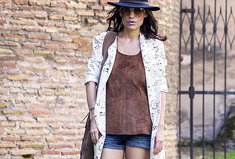 Para visitar la ciudad elegí combinar una levita perforada en blanco con shorts y top de ante marrón.