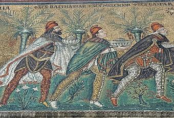 En ese mosaico, que mandó construir Justiniano en las paredes de la Basílica de San Apolinar el Nuevo, aparecen los tres reyes magos, sin camellos y más jóvenes de cómo los imaginamos. Caminan en fila, uno tras otro, con vasijas de plata entre las manos.