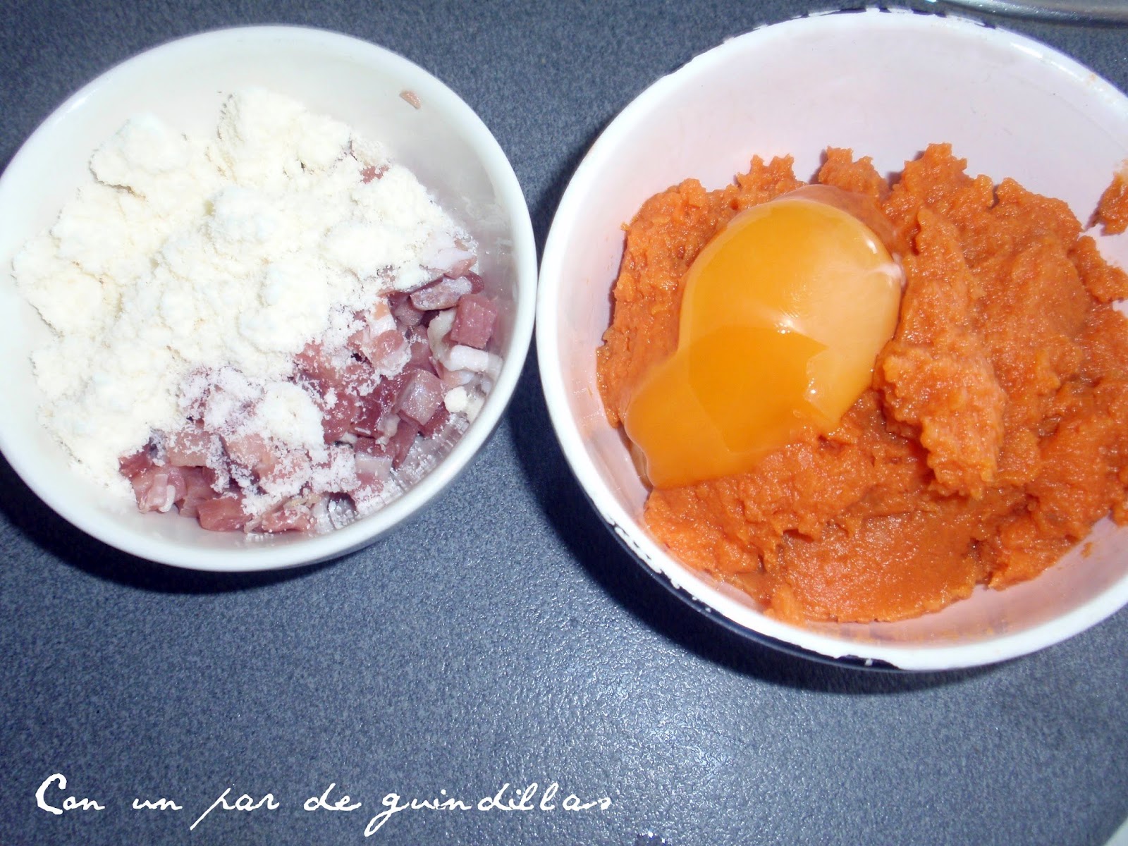 2.- Picamos muy fino el jamón y lo mezclamos con la batata, la yema de huevo, la nuez moscada, la pimienta y la sal.