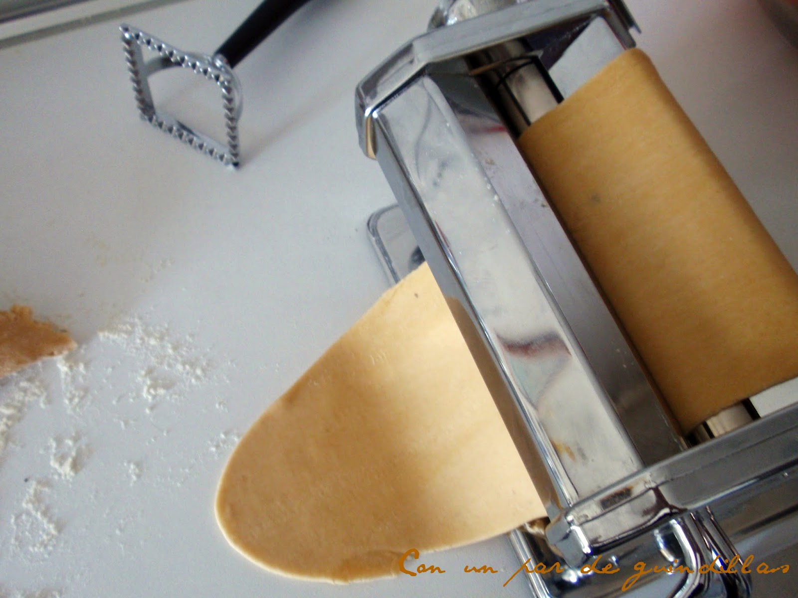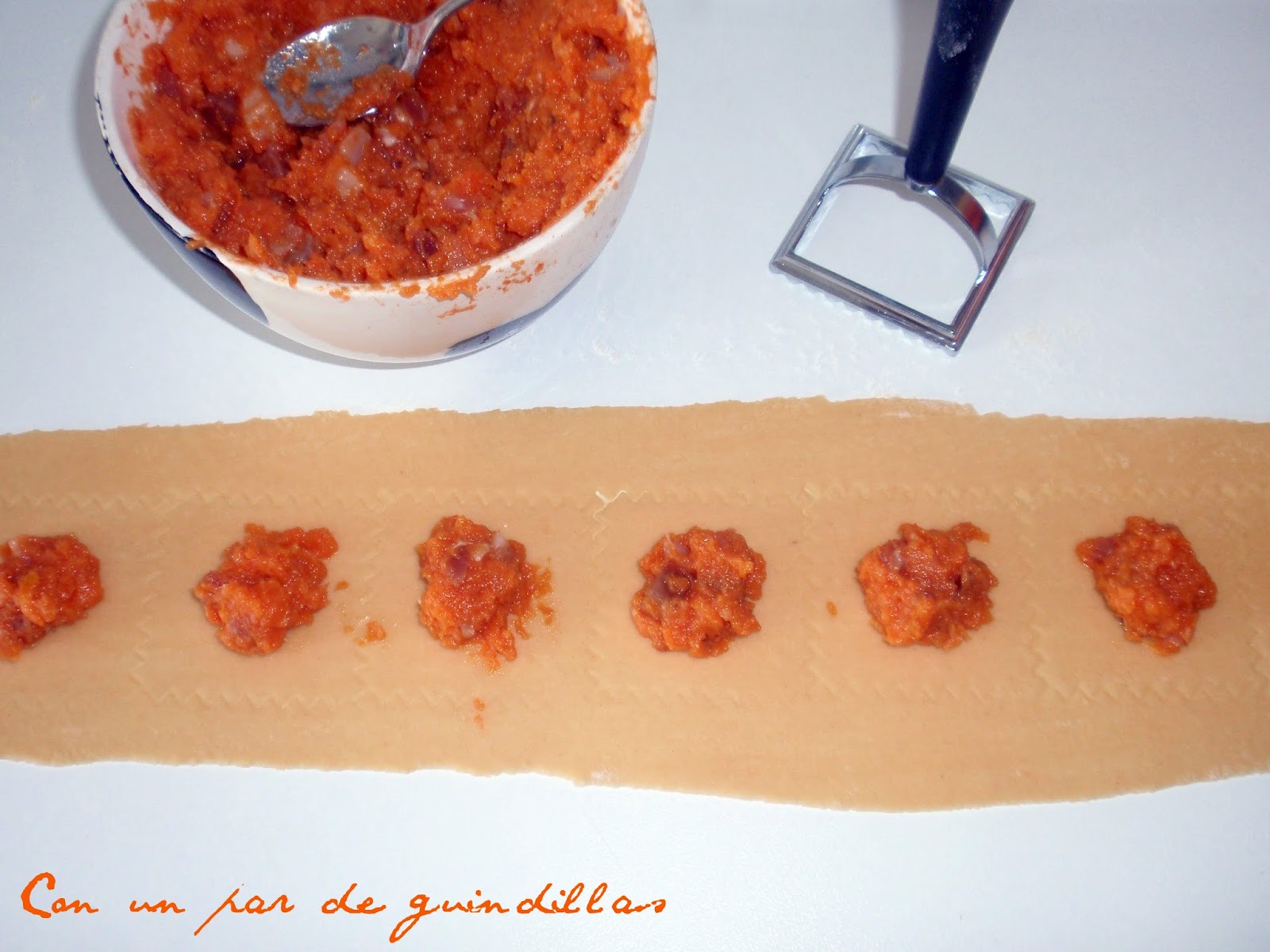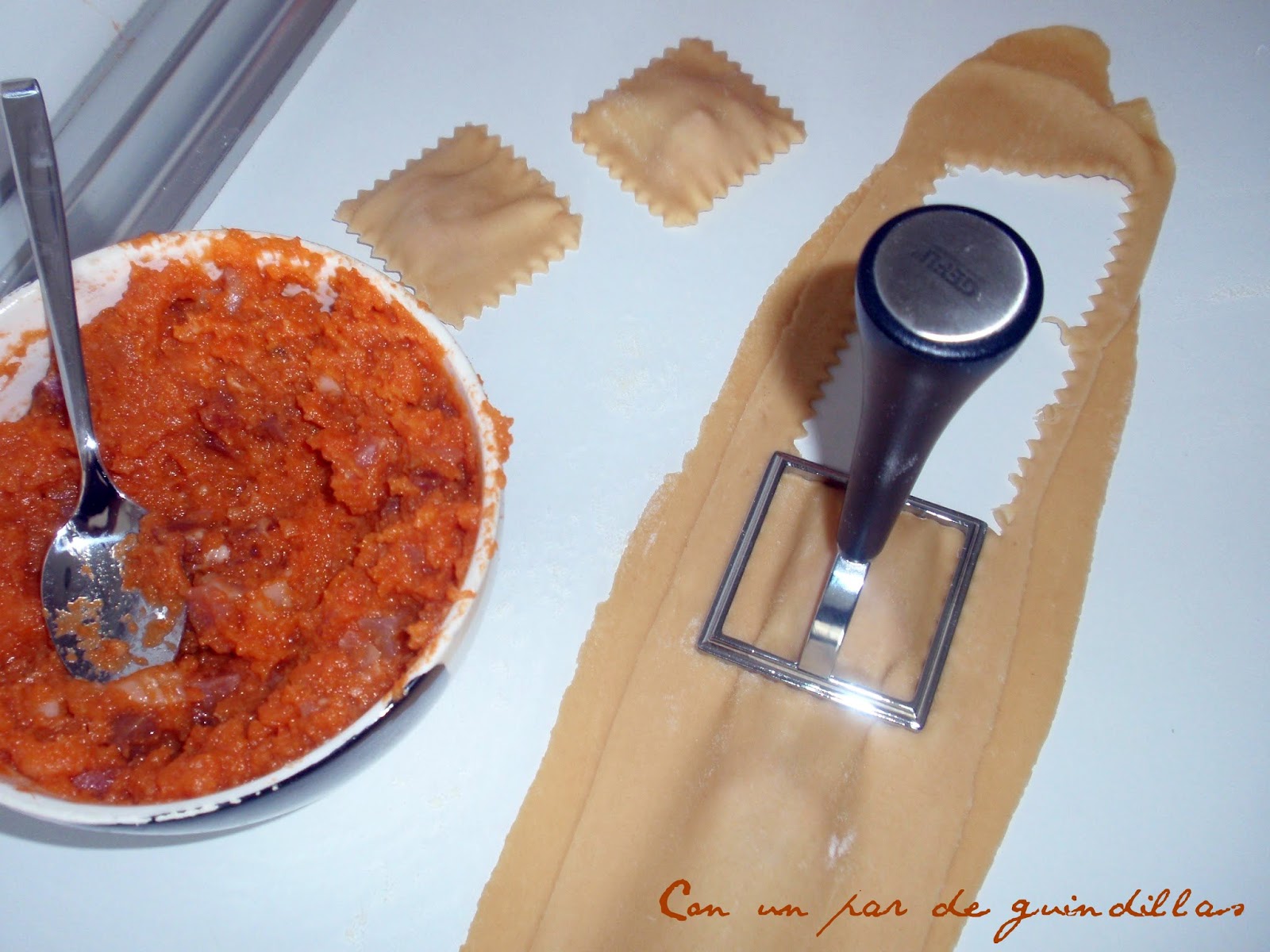 3.- Estiramos la masa y rellenamos los ravioli. Yo he usado un corta-ravioli de 6 cm para facilitar la operación, que se puede hacer con un cuchillo.