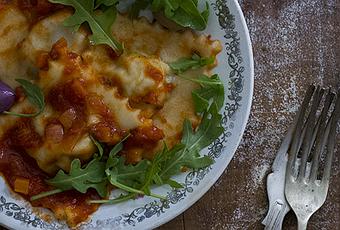 Cocemos los ravioli en agua salada durante 5 min. Escurrimos con cuidado y mezclamos con la salsa. Servimos acompañados de rúcula y queso parmesano al gusto.