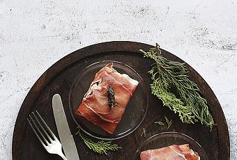 Saltear con el diente de ajo las gambas troceadas. Reservar. Añadir un poquito más de aceite de oliva y rehogar 5 minutos los espárragos trigueros, cortarlos y unirlos a las gambas. Untar una fina capa de queso crema en cada loncha de jamón serrano y poner dos en forma de cruz. En el centro poner un par de cucharadas del relleno y cruzar las tiras de jamón para que quede cerrado. Degustar al momento.