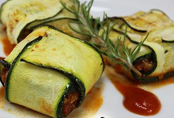 5- Colocar tiras de calabacín en cruz, poner un poco de relleno en el centro, envolver cruzando las tiras y pasar por la plancha a fuego fuerte vuelta y vuelta, sólo que se doren o al horno fuerte, solo que tomen color.
