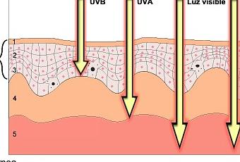 provoca el cáncer de piel? Ambas. Tanto los UVA como los UVB pueden dañar el ADN. Pero dado que los UVB llegan más directamente al ADN, éstos están más implicados en un 65% de los casos en la aparición de cánceres cutáneos. Pero, ¡cuidado!, eso no quiere decir que los UVA sean inocuos: otro tercio de los casos están provocados por ellos, siendo los más peligrosos los UVA de onda corta. UVB, quemaduras y melanoma. Su radiación posee mayor energía y es muy dañina, pero es parcialmente absorbida por la capa de ozono y las nubes. Son los causantes de las quemaduras, pero, además, pueden provocar un aumento del grosor cutáneo y melanoma (cáncer de piel). UVA, peligro invisible. Es la responsable de la pigmentación inmediata de la piel (proceso de bronceado). Penetra menos profundamente en ella y puede provocar enrojecimiento, manchas y envejecimiento cutáneo. Estos mantienen la misma intensidad a lo largo del año, incluso en los días nublados, durante todas las horas del día. Y como no provocan quemadura, se piensa - equivocadamente - que no son peligrosos. ¡Un error! Aún estando bronceada, la piel sigue absorbiendo estos rayos que degradan el colágeno y la elastina y causan auténticos desastres entre los melanocitos. El resultado es una piel más cuarteada y áspera, con arrugas más profundas y una flacidez más marcada, a lo que se suma la aparición de manchas.