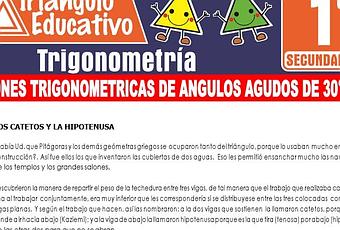 Aquí obtendrás GRATUITAMENTE el siguiente material sobre Razones Trigonométricas de Ángulos Agudos de 30° y 60° preparado especialmente para los estudiantes de Primero de Secundaria. Este contenido se desarrolla en el curso de TRIGONOMETRÍA y te lo compartiremos GRATIS en formato PDF.