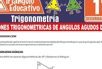 Aquí obtendrás GRATUITAMENTE el siguiente material sobre Razones Trigonométricas de Ángulos Agudos de 45° preparado especialmente para los estudiantes de Primero de Secundaria. Este contenido se desarrolla en el curso de TRIGONOMETRÍA y te lo compartiremos GRATIS en formato PDF.