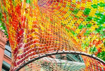The installation is made of 4224 laser cut panels. Each panel is a unique shape and printed with a custom color. The panels are connected using over 6,000 aluminum grommets. The shape is held in complete tension using a complex system of cables and tubes attached to the surrounding buildings.