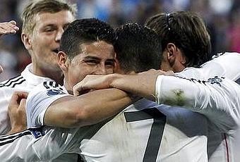 Los debutantes James Rodríguez y Toni Kroos celebrando uno de los tantos del goleador de la noche, Cristiano Ronaldo.