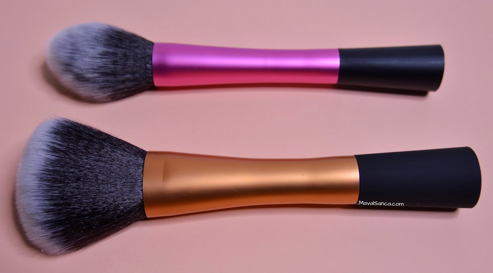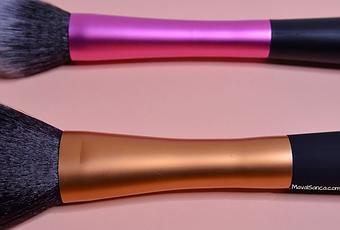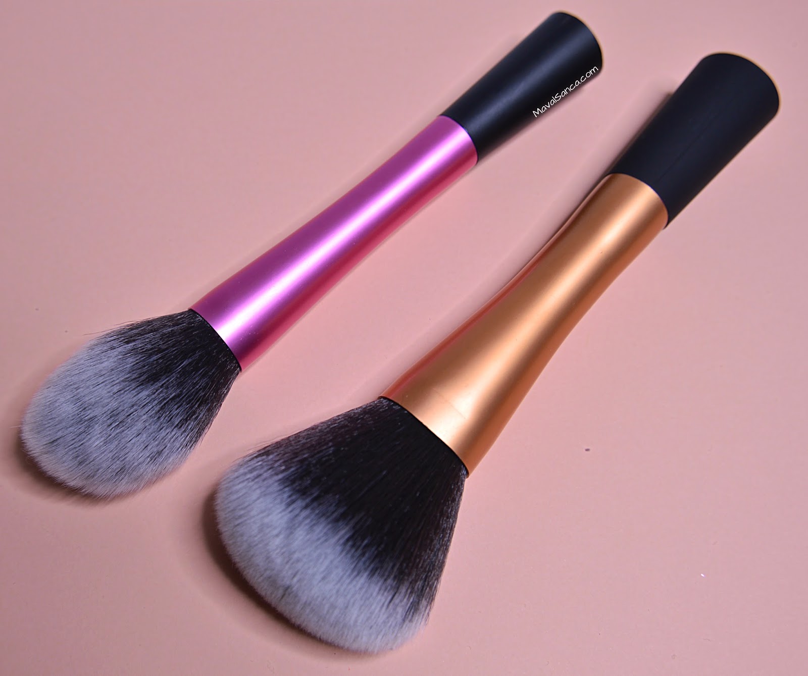 La rosa, especialmente indicada para aplicar colorete es una copia de la Blush Brush de Real Techniques.La dorada, especialmente indicada para aplicar productos en polvo en el rostro, es una copia de la Powder Brush de Real Techniques.