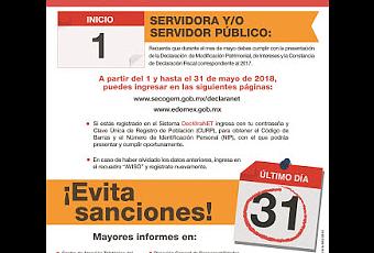 Toluca, Estado de México. La Secretaría de la Contraloría del Gobierno del Estado de México (Secogem) informa que durante el mes de mayo las y los servidores públicos están obligados a presentar su Declaración de Modificación Patrimonial, de Intereses, así como la constancia de Declaración Fiscal correspondiente a 2017, por lo que deberán cumplir con este trámite oportunamente para evitar una sanción.Para ello, pone a su disposición el Sistema Decl@raNET, un medio ágil, moderno, seguro y de fácil uso, disponible a través del sitio web www.secogem.gob.mx, que también incluye asesoría vía chat, en un horario de atención de lunes a viernes, de 9:00 a 18:00 horas.