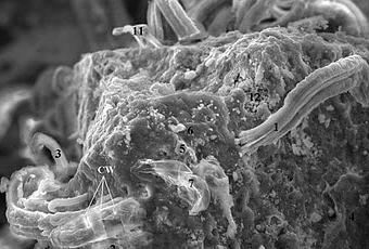 Largos filamentos sinuosos, helicoidales en espiral y polarizado con el ápice cónico corto incrustado en el meteorito Orgueil. Imagen cortesía: Dra. Marta Rossignol Strick, Museo Nacional de Historia Natural, París.