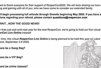 ...En su lugar, se va a celebrar la ReaperCon 2020 Live OnLine, que será completamente virtual,abierta y gratuita, pero se podrán adquirir productos exclusivos del evento, como la VIP Bag o la Swag Bag, entre otras cosas (Previo pago, obviamente). Será del 3 al 6 de Septiembre. En la imagen están todos los datos, el contacto y las FAQs preliminares.