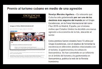 Hace unos días, en la Feria Internacional de Turismo de Madrid (Fitur) Cuba era galardonada con uno de los Premios “Excelencias”, por ser “uno de los destinos más seguros del mundo”.