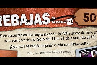Hasta el día 21 de este mes, la editorial madrileña Nosolorol Ediciones esta de rebajas. 50% de descuento en PDFs y gastos de envío gratis, solo a la península (Nada de las islas ni Ceuta y Melilla...), para ediciones físicas. Aplicable tanto a material de juego de rol como libros que no son ni cores ni suplementos de juego dentro de su catálogo.