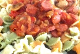 Ponéis a cocer la pasta, la que mas os guste. Mientras a fuego lento en una sartén ponemos tomate partido a laminas, champiñones cortados al gusto, cebolla y frankfurt, moved todo hasta q se deshaga el tomate y os quede como una salsa.