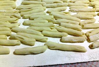 Dejar reposar la masa unos veinte minutos, cubierto con un trapo de cocina. Cortar partes pequeñas y formar cómo unos palillos (parecido a cuando se preparan los ñoquis, aquí la receta), pero más finos.