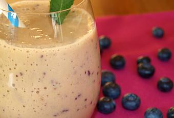Batido de plátano, melocotón y arándanos.