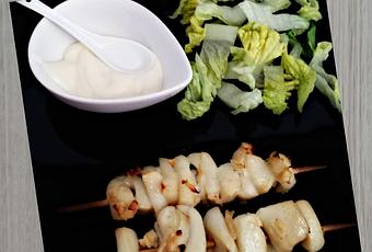 Podéis hacerlo como brochetas o comprar sepias pequeñitas y hacerlas enteras. Una vez limpia la sepia y preparadas las brochetas, poner en una bandeja de horno o un recipiente de cristal apto para horno y añadir el ajo, el zumo, el aceite y la sal. No os pongo cantidades porque para gustos colores. Meter al horno 30 minutos a 210º con calor arriba y abajo. A la mitad del tiempo girad las brochetas.