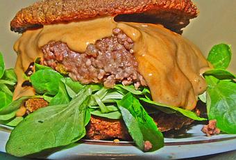 Decoramos nuestras hamburguesas caseras de Ternera, con canónigos, con Salsa Casera con roquefort, barbacoa y mostaza Colsman y las servimos inmediatamente.