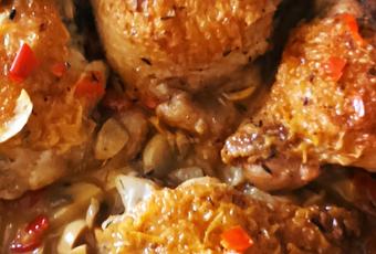 2. Poner en una sartén a fuego vivo los contra-muslos, hasta que doren y añadir pimientos rojo cortado en trozos pequeños, que se pochen bien.