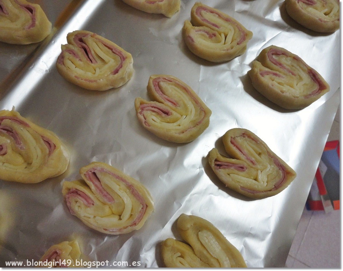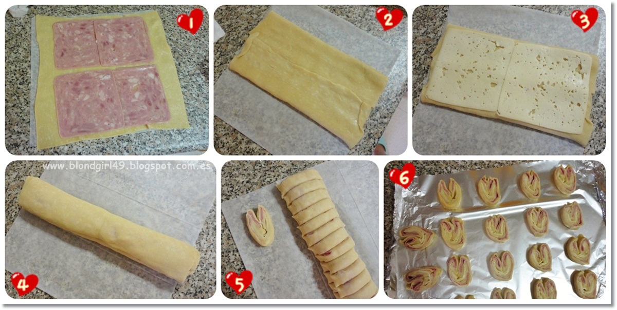 Hoy traigo una recetita de picoteo que podéis emplear para cuando tengáis invitados en casa, para cumpleaños, fiestas o para llevar a casa de alguien si os invitan a una comida/cena. Se trata de los corazones de hojaldre de jamón y queso, son una delicia y sencillísimos de preparar. Además quedan muy bonitos colocados en la mesa, yo los hice para el cumple de mi madre para ir picando y os aseguro que desaparecieron bien rápido jajaja Ya veréis que esta receta se parece muchísimo a las palmeritas de hojaldre pero en versión salada. Si queréis ver la de las palmeritas de azúcar podéis hacerlo en esta entrada. ¿QUÉ INGREDIENTES NECESITAMOS?- Masa quebrada (yo he usado la congelada de Mercadona). Tiene que ser quebrada para que no suba el hojaldre y así se nos quede la forma de corazón.- Jamón o chopped en lonchas (el que más os guste, yo uso chopped -es mas jugoso que el jamón-)- Queso en lonchas (el que más os guste, yo uso havarti)¿CÓMO SE PREPARA? 0. Antes de empezar podemos ir precalentando el horno a 180ºC1. Extendemos la masa quebrada (si está congelada esperaremos a que se descongele) y pondremos encima unas cuantas lonchas de jamón o chopped.2. Ahora llevamos los extremos de la derecha y la izquierda hasta que se toquen en el centro3. Así como nos había quedado ponemos encima unas lonchas de queso4. Ahora volvemos a coger los extremos de la derecha y de la izquierda y los llevamos al mismo centro que antes, así formaremos un rollo5. Ahora tendremos que ir cortándolo dejando 1cm, así formaremos los corazones,6. Los ponemos en papel de aluminio embadurnado de aceite (para que no se peguen demasiado) y los chafamos un poquito para que nos quede la forma deseada. Deberemos meterlo en el horno hasta que veamos que quedan doraditos (unos 10 ó 15 min). Son una delicia tenéis que probarlas ¡se hacen rapidísimo! ¿Qué os ha parecido la receta? ¿creéis que os gustaría?Un besito muy grande ¡feliz miércoles!