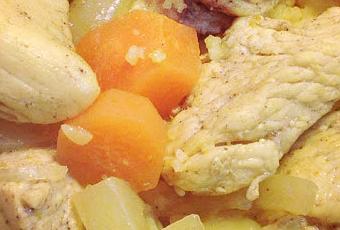 Agregamos las pechugas y cubrimos las verduras y la carne con caldo de verduras o con agua y le echais curry al gusto y dejais hervir hasta que la verdura este tierna (yo compruebo siempre la zanahoria que es la que más tarda). Cuando esté todo tierno lo sacamos del caldo.