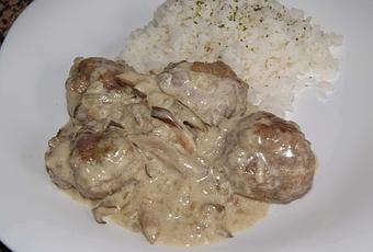 Servimos las albóndigas con un poco de salsa y algunas setas, acompañadas del arroz cocido. ¡Están deliciosas!