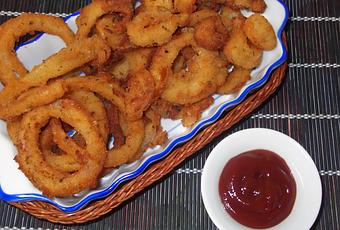 Comenzamos la semana con unos aros de cebolla crujientes y caseros¡¡¡¡ , están deliciosos, están mejor incluso que los de los restaurantes americanos, esta es una receta casera, fácil y económica.Receta:Coges una cebolla que no sea muy pequeña, la pelas y la cortas en rodajas del grosor que prefieras, saca los aros de cada rodaja, ponlos en remojo un rato en agua. Mientras en un bol pon harina de trigo, harina de garbanzos, copos de puré de patata, pimentón de la vera, y sal al gusto, mézclalo todo y reserva. Por otro lado calienta un poco de tónica (medio bote más o menos) hasta que hierva, entonces añádela a la masa, remueve bien con unas varillas hasta que adquiera una consistencia de una masa fina no muy espesa (como una papilla).Pasar los aros por la masa, dales un buen baño, que queden bien impregnados, una vez bien bañados, pásalos por pan rallado (con ajo y perejil lo puse yo) y dales un buen rebozado, luego los fries en la sartén con abundante aceite caliente, yo le puse aceite de oliva mezclado con aceite de girasol para freirlos, en un minuto están listos, escúrrelos en papel y a comer¡¡¡¡ La receta la he sacado de aquí: http://www.pinterest.com/pin/420242208951471020/