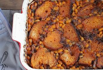 Ya terminada la cocción, sacamos la fuente del horno y cubrimos la superficie con trozos o rebanadas de pan rústico, apretándolas un poco con el dorso de una cuchara para que entren en el caldo y absorban la grasa superficial. Una vez colocado el pan, metemos otra vez la fuente a hornear otros 15 minutos, subiendo la temperatura a 180º para que el pan se dore un poco y se seque en la superficie.