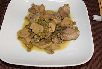 Dejamos que se cocine todo unos 20 minutos, hasta que la salsa se reduzca casi al mínimo. 5 minutos antes de acabar echamos los guisantes y removemos con cuidado para que no se rompan.