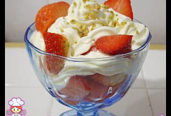 Coges las copas donde lo vayas a servir y echas unas fresas, después con la ayuda de una manga pastelera le pones la nata y por encima lo decoras con un poquito de almendra crocanti y 4 trocitos de fresas.