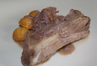 Cuando esté hecha la carne la retiramos y la cortamos en porciones siguiendo el hueso. Probamos la salsa y rectificamos de sazón. Servimos la costilla con un poco de la salsa por encima, acompañada de nuestra guarnición favorita.