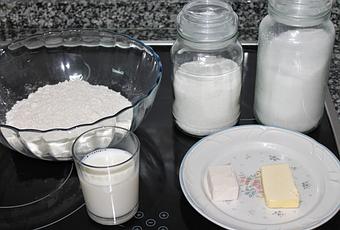 Comenzamos calentando la leche. Lo normal sería calentarla hasta una temperatura media, que si metemos un dedo no sepamos si está fría o caliente. Yo la caliento un poco más por que guardo la levadura en el congelador. De esa forma disuelvo la levadura en la leche sin que se enfríe mucho y con más facilidad.Con la leche templada disolvemos la levadura e ella y dejamos reposar 10 minutos. Yo suelo aprovechar en esto momento para ir preparando el resto de los ingredientes, que esta vez estaban listos para la foto pero normalmente no lo están.