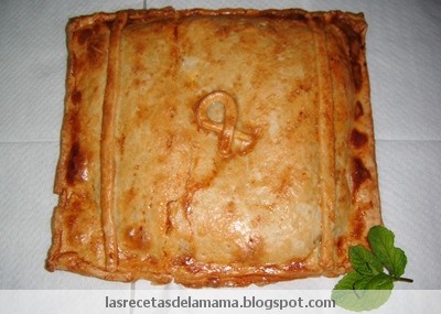 Decoracon las tiritas que has guardado del hojaldre, pon una a la derecha y otra a laizquierda y un lacito en el medio. Bates el huevo y con un pincel se lo untas ala empanada.