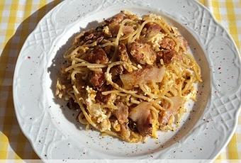 Las recetas de la mamá te sugiere que pruebes este sabroso plato de espaguetis con huevo. Este plato de espaguetis con huevo está compuesto de cebolla, beicon, chorizo, huevo y nuestra pasta favorita unos buenos espaguetis.