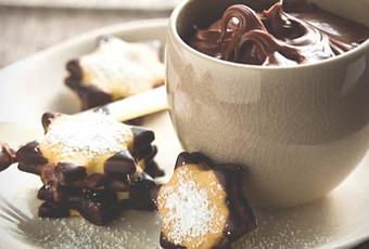 Moja las puntas de las estrellas en el chocolate fundido y deja las galletas sobre papel para hornear hasta que el chocolate se endurezca.