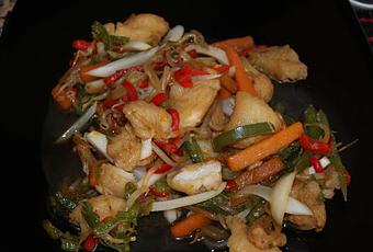 Cortamos los filetes de lenguado en trozos grandes. Los incorporamos a la sartén y regamos con la salsa de soja. Subimos el fuego y dejamos que se cocine todo bien mientras revolvemos de vez en cuando.