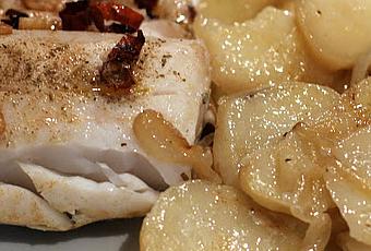 Servimos el pescado, con la guarnición de patatas y cebolla, y acompañamos