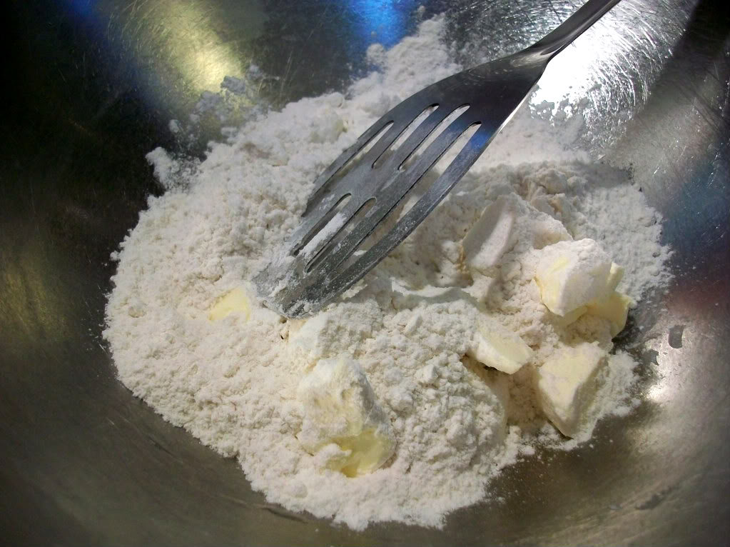 En otro bol combinamos el resto de la mantequilla fría, cortada en pedacitos; con el resto de la harina.