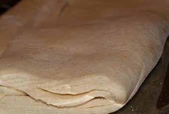 Tratando de que la masa nos quede lo más uniforme posible. Tratamos de no pasar el rodillo a las esquinas, para no desinflar la masa. Tratamos de dejar 1/2 pulgada de las esquinas sin pasarle el rodillo. Extendemos la masa hasta conseguir un cuadrado de 16 pulgadas de largo y 10 de ancho. Volteamos la masa y retiramos el exceso de la harina. Doblamos la parte de harriba, hacia el centro. Luego doblamos la parte de abajo hasta el centro también.