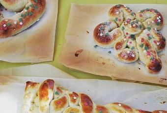 Los niños pueden dar la forma que prefieran a la masa, después se pinta con huevo batito, se decora un poco con azúcar o anisitos de colores y al horno.