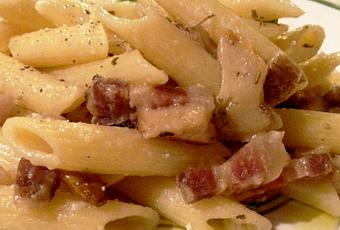 200 gr. de Pasta Penne o Macarrones, 70 gr. de panceta o tocineta, 100 gr. de setas boletus congeladas o secas, vino blanco, cebollino, romero, pimienta negra molida, parmesano rallado y sal.