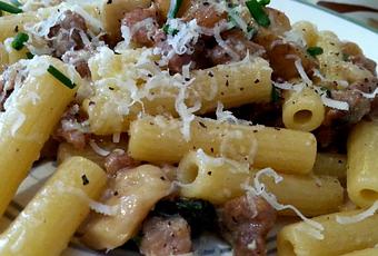 360 gr. de pasta Sedani, 2 salchichas, 100 gr, de setas boletus, parmesano rallado, 1 diente de ajo, cebolla, albahaca, romero, cebollino, brandy, guindilla/picante, sal y aceite.
