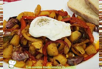 Echa el aceite en una sartén, unos 200 ml, lo calientas a fuego medio, añades las patatas y las fríes hasta que estén doradas. Las retiras y las pones en una bandeja con papel absorbente, para que suelten todo el aceite.En otro sartén a fuego medio, añades un par de cucharadas de aceite, puedes utilizar el aceite de las patatas, echas los pimientos junto con los ajos, échale sal al gusto. Déjalos bien dorados y los retiras para luego, escurriendo el aceite.