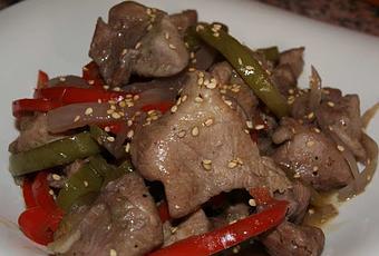 Pelamos la cebolla. Retiramos las semillas a los pimientos y lo cortamos todo el juliana. Cuando la carne esté dorada la sacamos de la sartén y reservamos, manteniendo todo el aceite en la sartén. Echamos la cebolla y subimos el fuego para que se vaya cocinando bien, con una pizca de sal.
