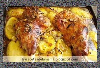 A continuación, lo introduces al horno y cuando lleve 30 minutos le das la vuelta y lo dejas unos 30 minutos más. Servir un trozo de paletilla con patatas, cebollas y un poco de salsa.