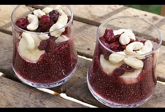 Cubre las semillas de chía con el jugo de arándanos rojos. Mezcla y guarda en la nevera durante toda la noche (las semillas tienen que absorber el jugo y tener la consistencia de un flan). Pasado este tiempo, agrégale la miel. Mezclamos. Repartimos el contenido en dos tazas. Decoramos con arándanos y unos trozos de plátano.