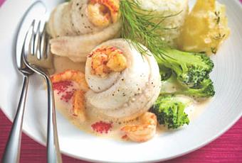 Mezcla 90g. de carne de cangrejo con una cucharada de chalota. Reparte por encima de los filetes, enróllalos y fijalos con un palillo.
